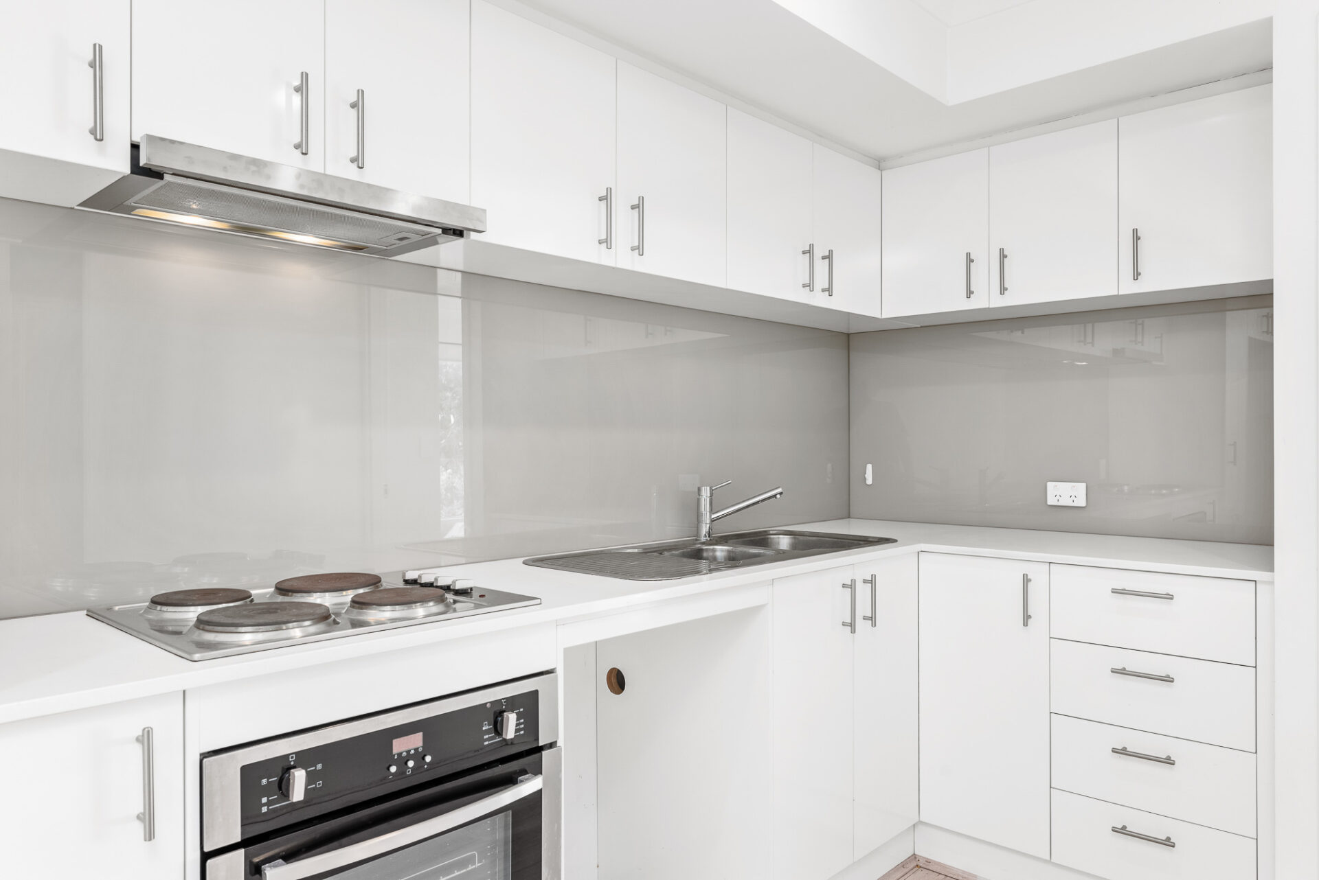 - Exquisite kitchen with stone bench top, glass splashback and stainless steel appliances