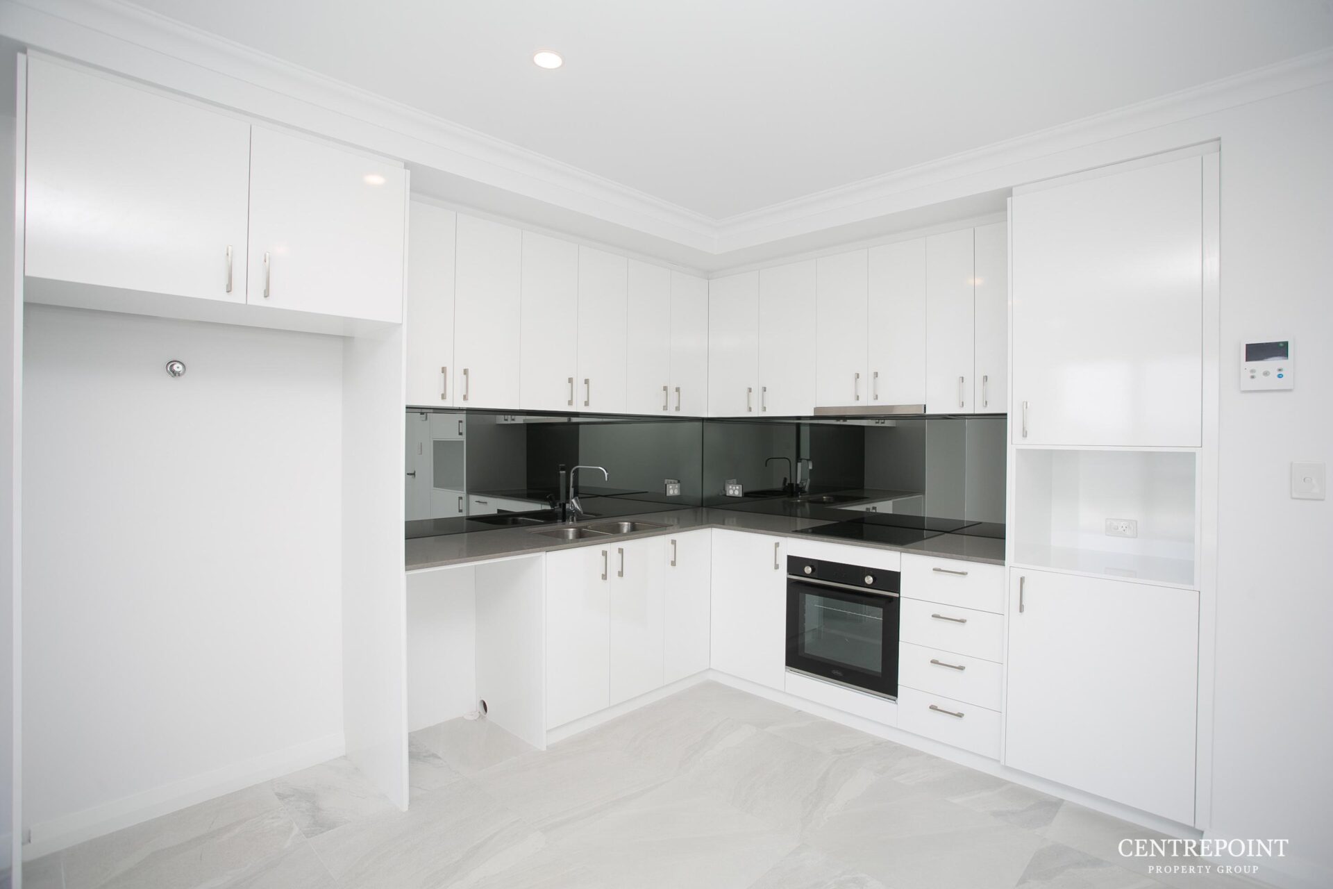 - Kitchen with stone bench tops, glass splash back and stainless-steel appliances