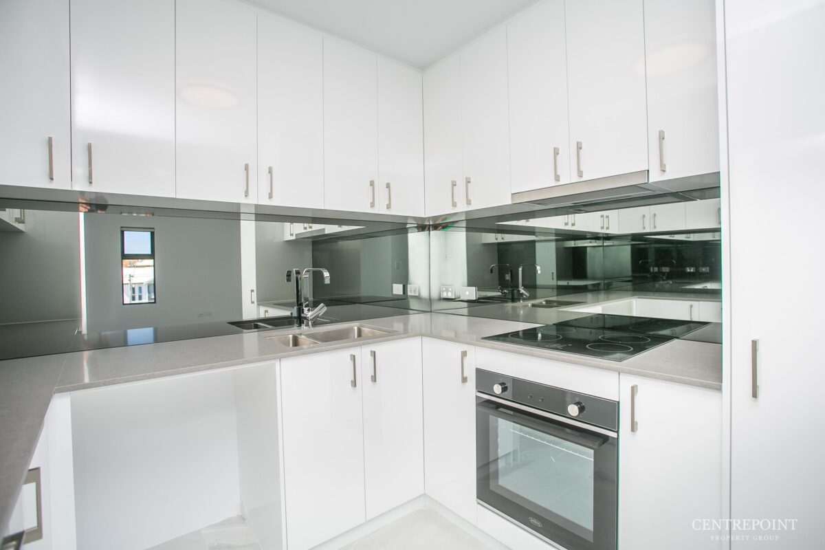 Exquisite kitchen with stone bench tops, glass splash back and stainless-steel appliances