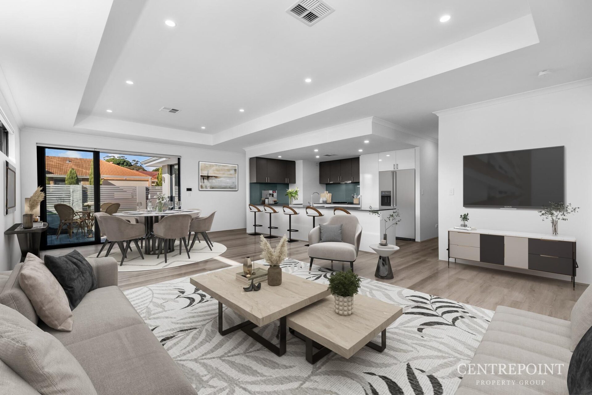 • Spacious open plan light filled living area with quality laminate hybrid timber flooring