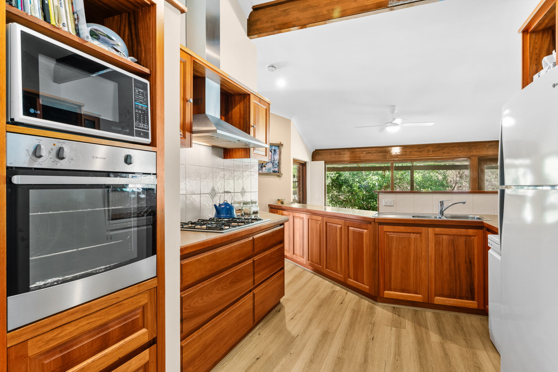 The country-style kitchen sits at the heart of the home, elevated to capture the view while allowing easy connection with both indoor and outdoor living spaces. Long benches, ample storage, quality appliances and a double fridge recess make it ideal for family meals, entertaining and weekend hosting. Outdoors, the shaded veranda and alfresco areas spill directly toward the brook, creating a peaceful retreat ideal for entertaining, unwinding or simply enjoying the changing seasons.