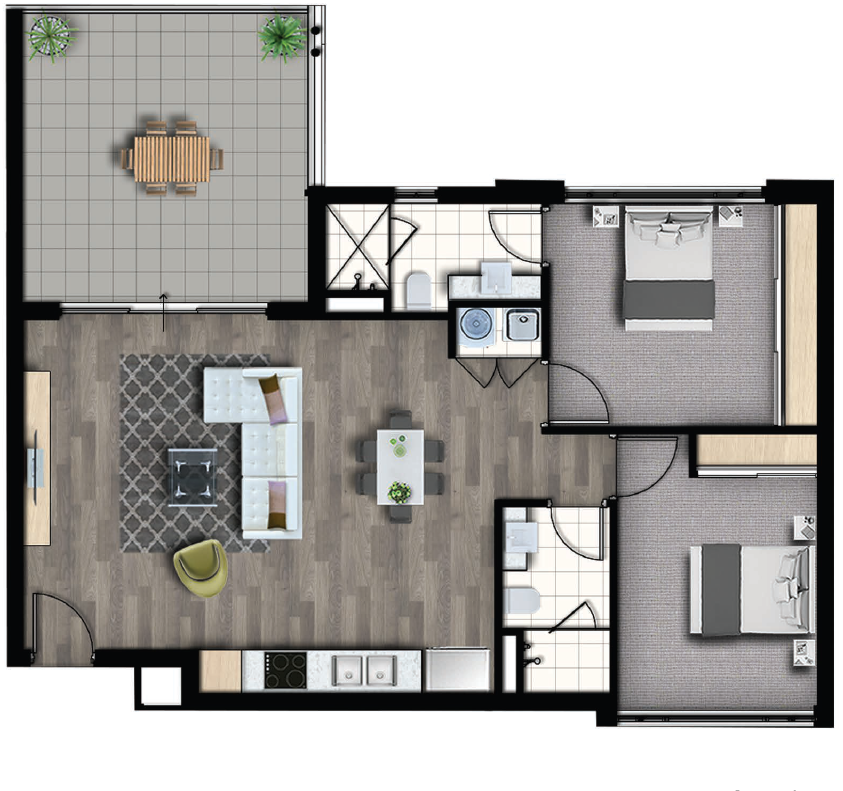 Stylish ApartmentThis unfurnished two bedroom, two bathroom apartment is on the second floor and comes with one covered car bay.