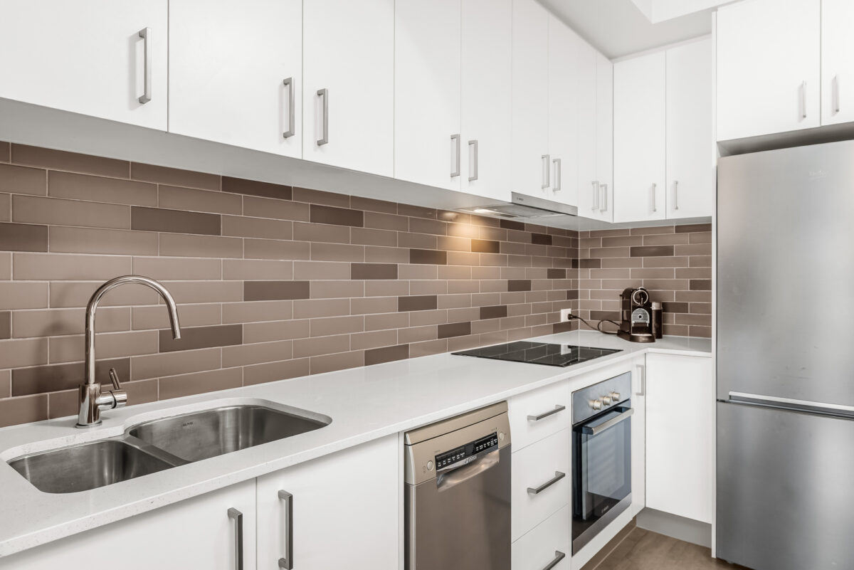 • Gourmet kitchen with stainless steel Bosch appliances including a dishwasher, oven and induction cooktop, overhead storage, tiled splashback and stone countertops