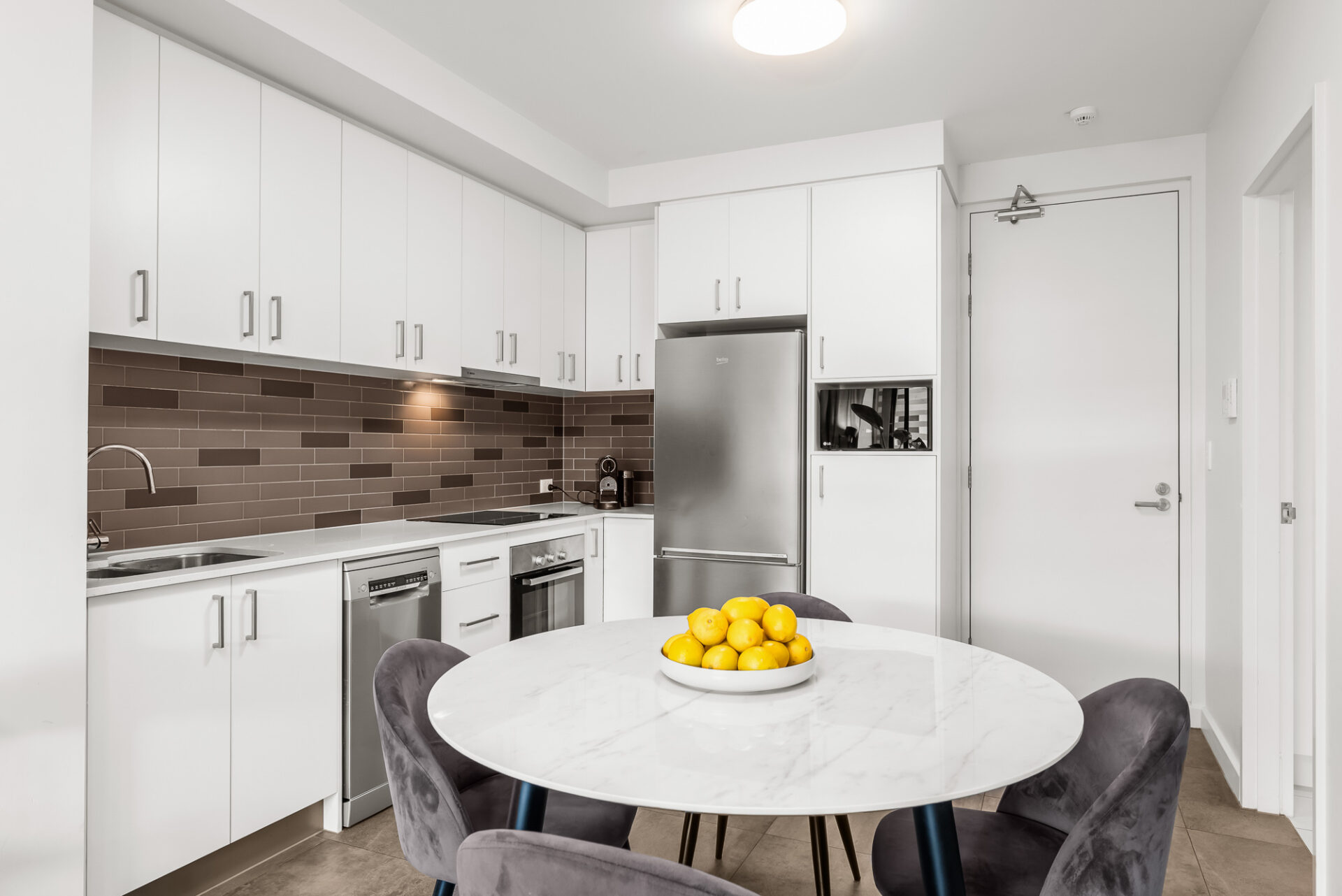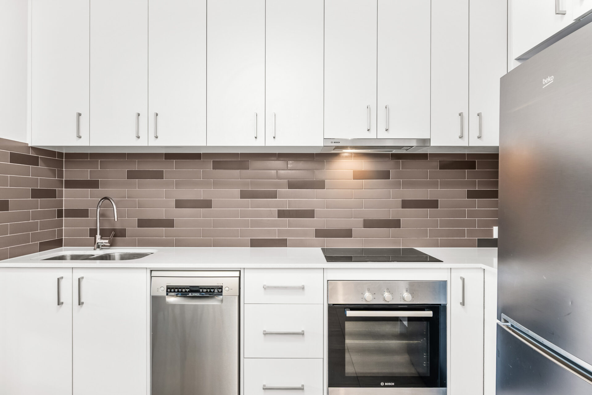 • Gourmet kitchen with stainless steel Bosch appliances including a dishwasher, oven and induction cooktop, overhead storage, tiled splashback and stone countertops