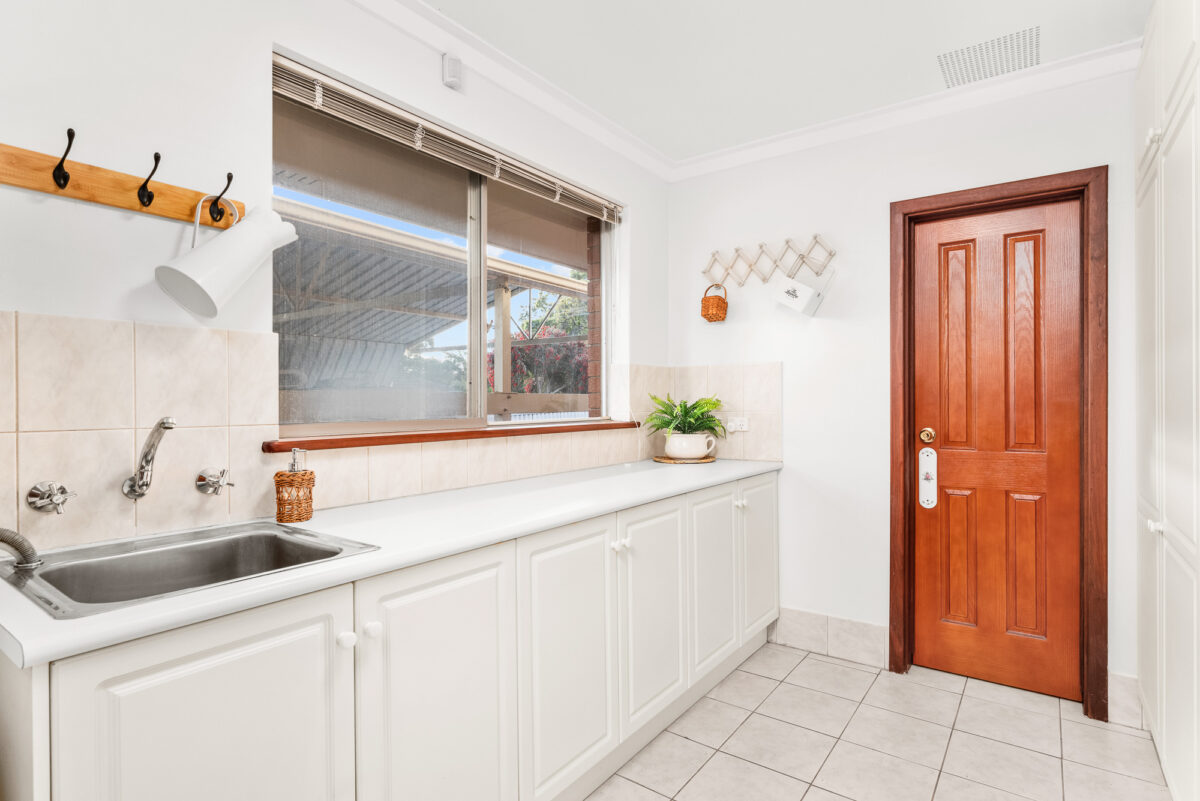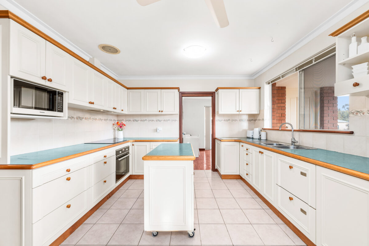The kitchen, designed for both style and functionality, remains as pristine as the day it was built. A generous window offers a lovely view of the backyard, making it the ideal spot to keep an eye on the kids while preparing lunch.